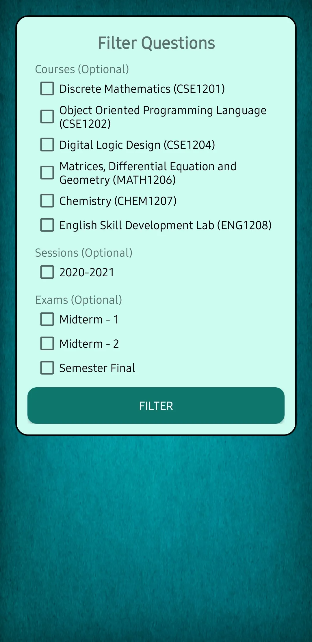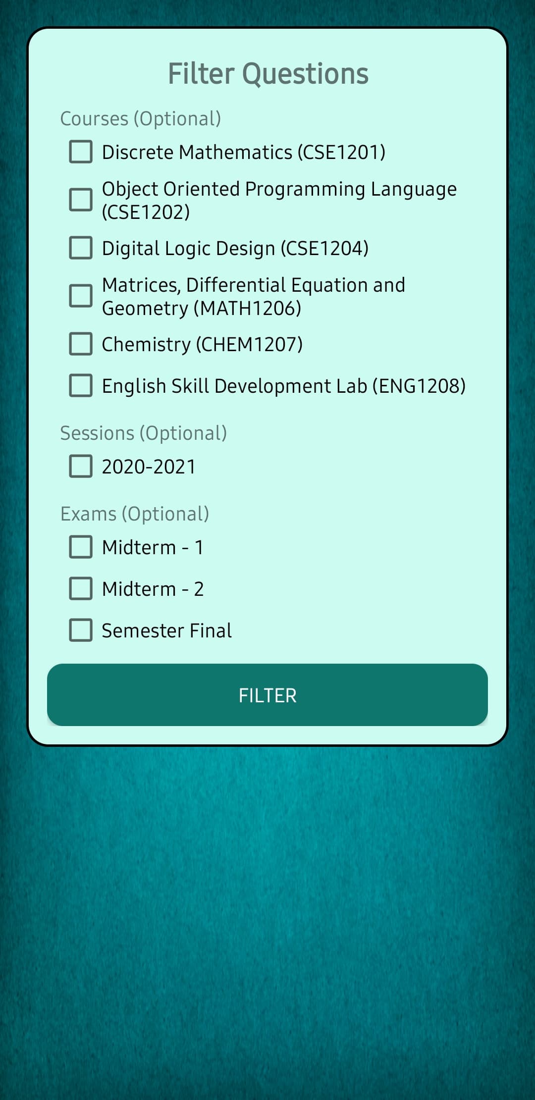 A simple app to search all previous questions of my university and filter them. It's an mobile frontend for the Question Vault website.